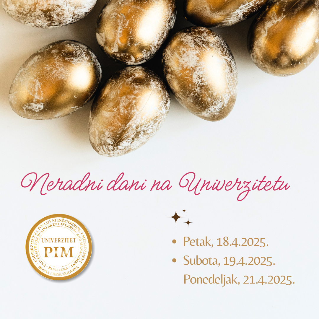 Neradni dani na Univerzitetu PIM povodom vaskršnjih praznika Obavještavaju se studenti, nastavni kadar i zaposleni Univerziteta za poslovni inženjering i…